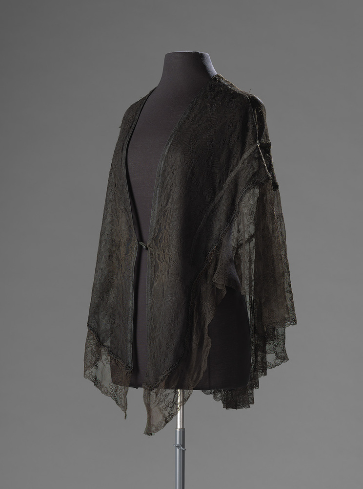 Zwarte omslagdoek van kant op tule. De omslagdoek past bij een late crinolinejapon of crinolinerok. Het kant is chantillykant met machinale breisels.