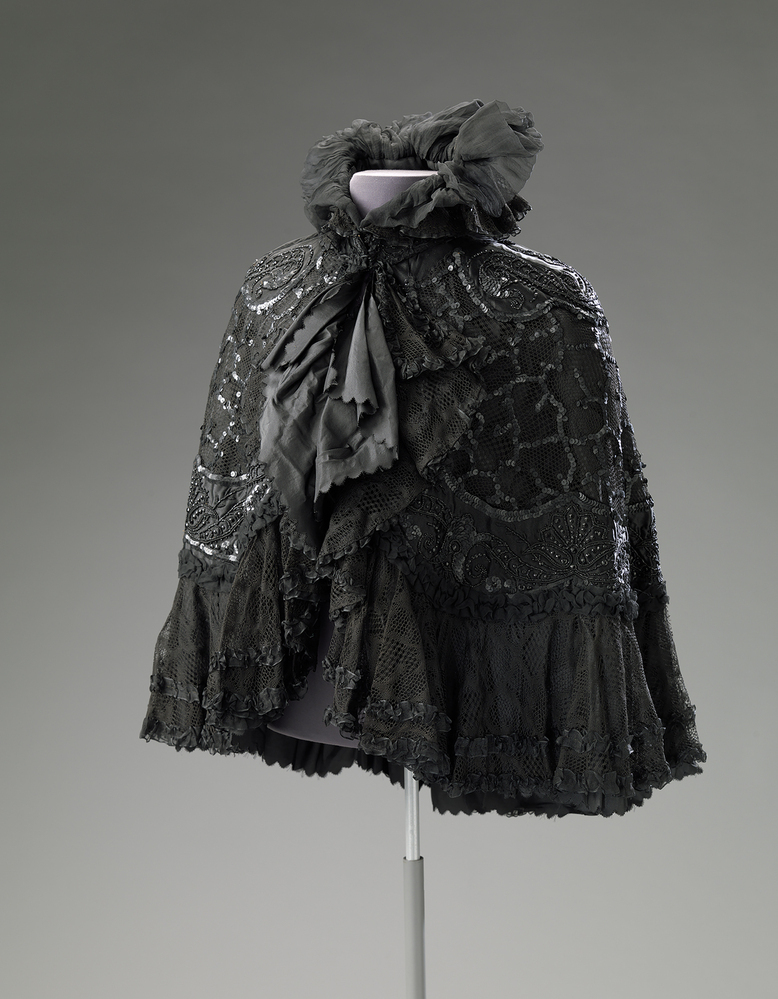 Cape van zwarte tafzijde met opstaande kraag met geplooide stroken zwart gaas en zwart machinaal kant. Geheel versierd met gitten en pailletten. Langs de zoom een geplooide strook zwart machinaal kant over een geplooide strook tafzijde met geschulpte zoom. Sluiting middenvoor met twee metalen haken en ogen.