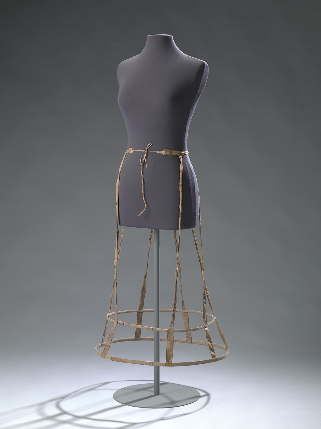 Crinoline van crèmekleurig katoen. Tailleband waaraan zeven verticale banden. Onderaan twee stalen hoepels, bekleed met idem katoen. De stalen banden zijn allebei aan de voorzijde gesloten door middel van twee katoenen bandjes. Omdat de drie achterste verticale banden dichter bij elkaar zijn geplaatst staat de crinoline aan de achterzijde iets uit. Tailleband aan de voorzijde gesloten met twee striklinten. De crinoline is samengesteld uit oudere onderdelen, de roestvlekken duiden erop dat de rok oorspronkelijk meer hoepels had. De hoepelrok is geheel met de hand genaaid.