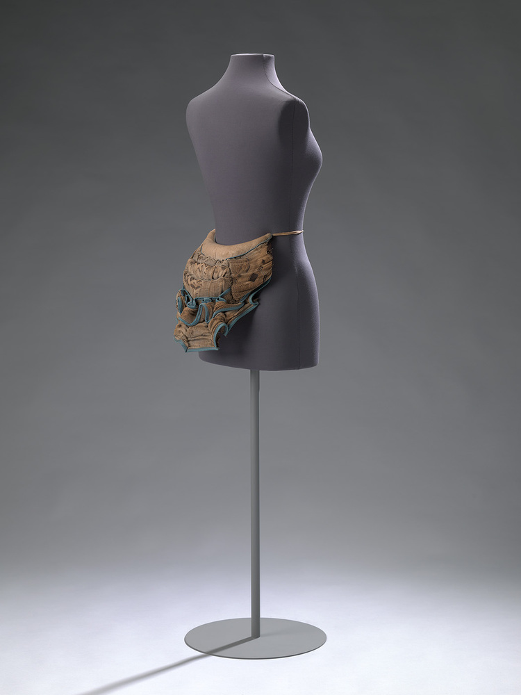 Tournure van katoen en paardenhaar. Opgevulde tailleband van crèmekleurig katoen afgebiesd met blauw katoenen vulkoord. Aan de uiteinden twee striklinten voor om de taille te bevestigen.