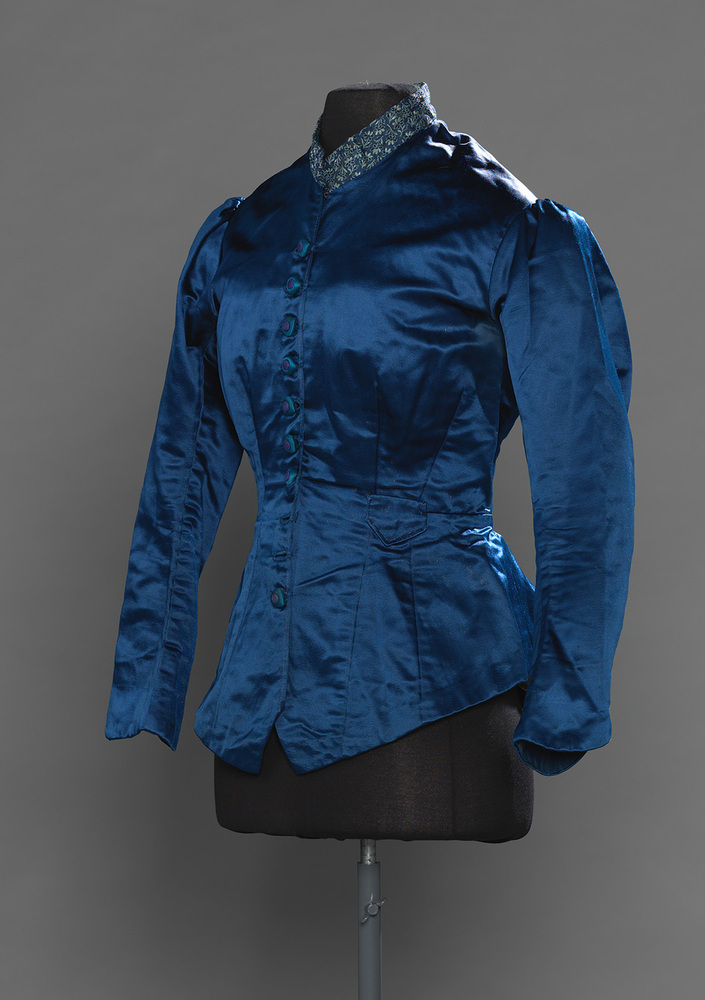 Blauw zijden japonlijfje met gebloemde boord, lange mouwen en knoopsluiting middenvoor. Aan de linkerzijde bevindt zich een horlogezakje. Middenachter een split zodat het lijfje op de tournure valt. Het lijfje is vermaakt een aangepast. Het lijfje is uitgelegd. De ronde rugnaden duiden op een lijfje dat tussen 1868-1873 te dateren is. Het lijfje is lang, dat duidt op een datering in de jaren 1870-1880. Waarschijnlijk is het lijfje in de jaren 1875-1880 aangepast om bij een tournure te kunnen dragen. Ook het gebloemde boord is waarschijnlijk in deze periode toegevoegd.