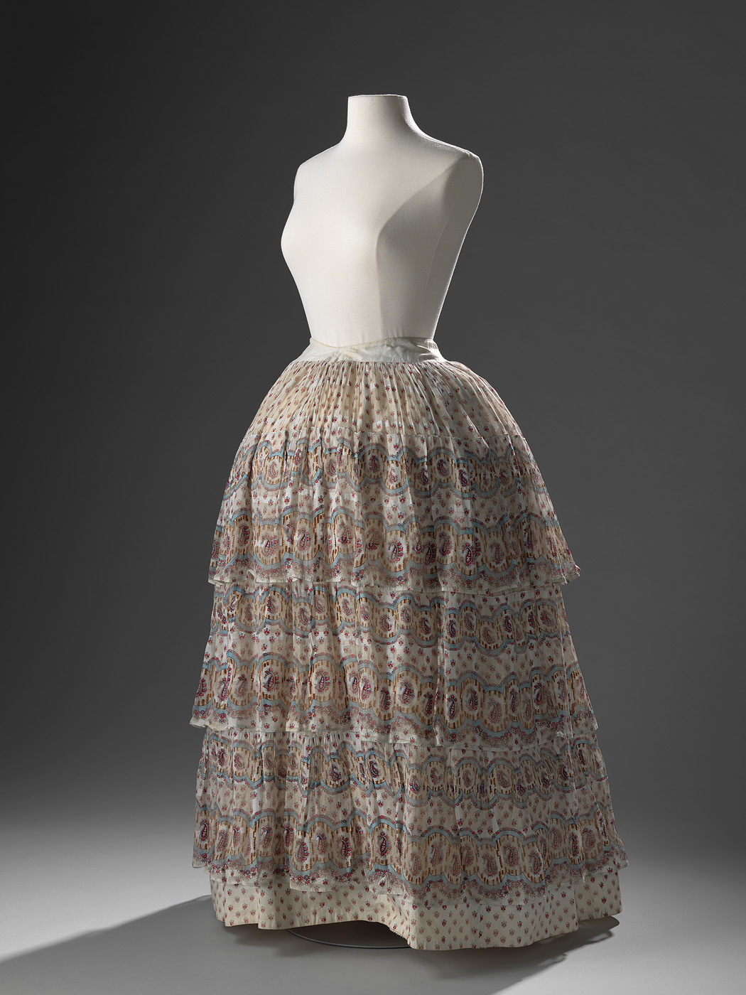 Rok 'a la disposition' met drie stroken voor een crinoline. De zoom is verstevigd en kwam onder de stroken uit. Gebruikelijk was dat de stroken tot op de grond vielen.