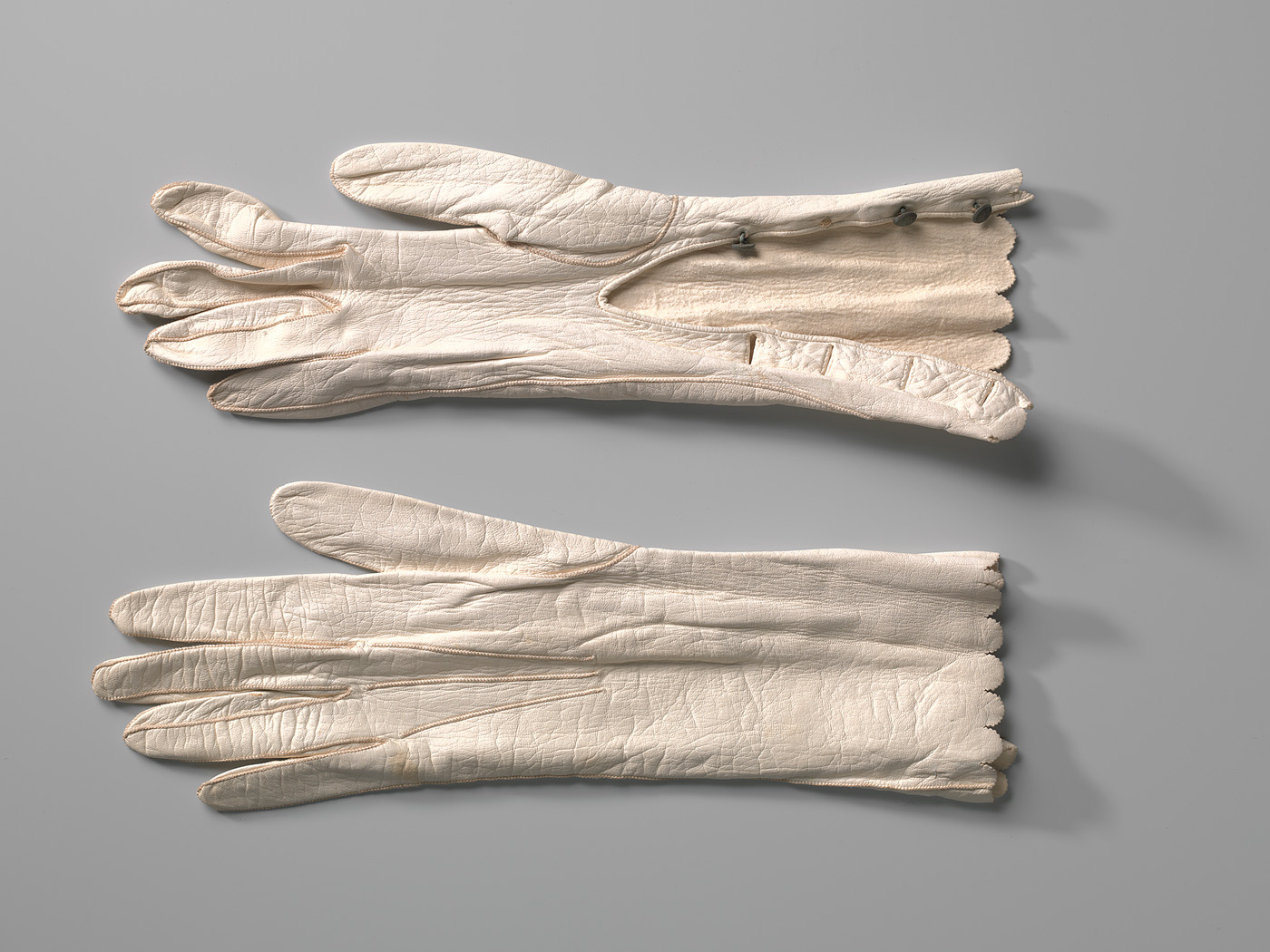 Paar witte dameshandschoenen van glacéleer met vier metalen knoopjes. Gedragen door Maria Mechtildis Ludovica Smits (1855-1926) op haar huwelijk (9-9-1880) met Petrus Johannes Coovels (1850-1901).