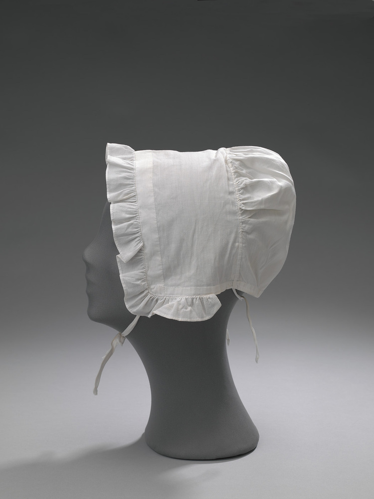 Witte katoenen muts, met rand van wit katoen met ingeweven ruit. Twee banden om in te halen die op het hoofd worden vastgezet. Twee banden om onder de kin te strikken. Cornetmuts model, met brede voorstrook (zodat het kapsel ver naar achteren gezet kan worden). Nachtmuts of dienstbodemuts.- Trefwoorden