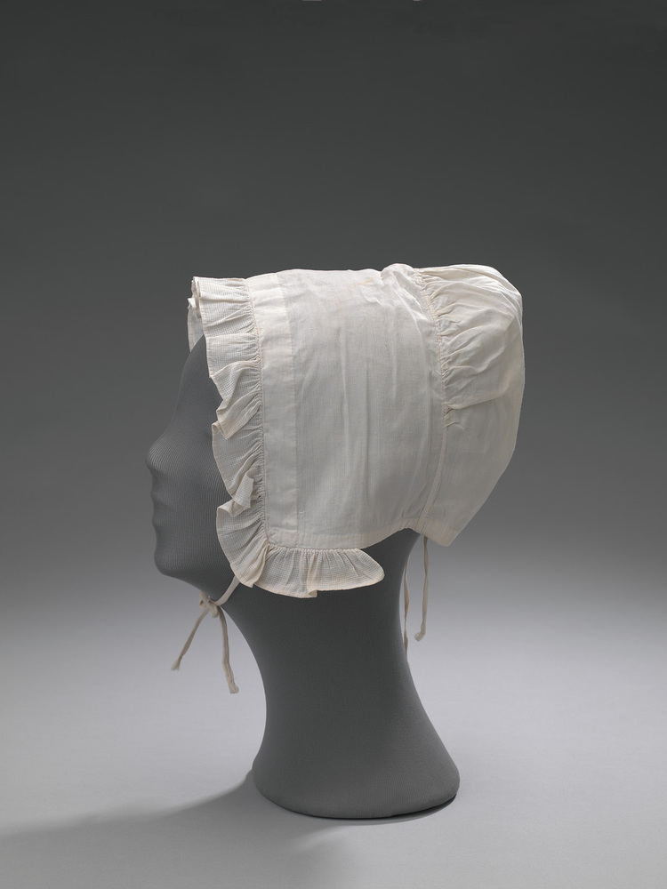 Witte katoenen muts, met rand van wit katoen met ingeweven ruit. Twee banden om in te halen die op het hoofd worden vastgezet. Twee banden om onder de kin te strikken. Cornetmuts model, met brede voorstrook (zodat het kapsel ver naar achteren gezet kan worden). Nachtmuts of dienstbodemuts.- Trefwoorden