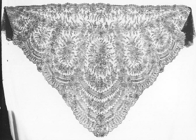 Zwarte driehoekige sjaal van (niet machinaal) chantillykant, in de mode rond 1860-1870. Mooi gaaf en groot exemplaar, met groot bloemmotief. Een groot bloemmotief is gebruikelijk vodeor deze omslagdoeken. Ongebruikelijk patroon voor een soort omslagdoek als deze: meestal is er een groot bloemmotief centraal in het midden met uitlopers. Hierop wel veel variatie mogelijk.