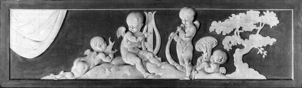 Witte geschaduwde schildering op lichtbruin fond. Dit rechthoekige schilderij hoort waarschijnlijk boven de spiegel op de schoorsteenboezem.- HerkomstAfkomstig uit Herengracht 488; schenking 't Woonhuys, Amsterdam, 1972