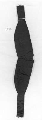 Ceintuur in vestvorm, zwart ripszijden cumberband, gevoerd met wit satinet. Knoopjes overtrokken met dezelfde stof met 2 zakjes. Gordelvest is variant van de cumberband - de naam is afgeleid van kamerband, ontleend aan de Turkse band en ceintuur. Na 1893 in Europa gedragen bij smoking en avondkleding.- Trefwoorden