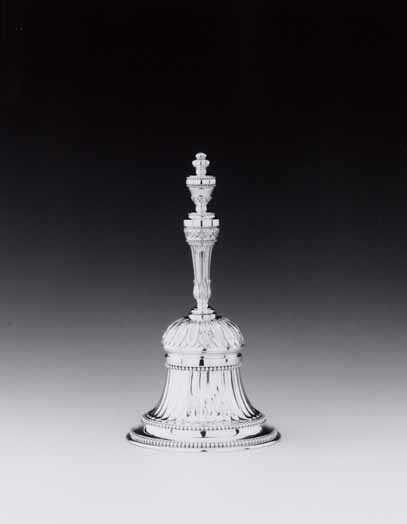 Klokvormige tafelbel met taps toelopende steel en klepel. Lichaam met cannelures. Schouder, aanzet steel en basis knop met straalsgewijs een dubbele rij, deels geciseleerde, laurierbladeren. Steel met cannelures, waarboven een band met acanthusbladeren, overgaand in gladde vaasvormige knop. Opgelegde parellijsten langs onderrand bel, steel en knop.