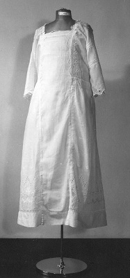 Japon van witte katoen met broderieranden en borduursels. Vierkante hals, middenvoor doorlopende baan van effen katoen. Lijfje bestaat uit een baan van een broderie anglaise rand die van de schouder naar de taille loopt. Op de rok naast de effen baan twee panden die gebroduurd zijn. Aangeknipte korte mouwen met onderste gedeelte met rand van broderie, die hetelfde is als het lijfje. Aangerimpelde rok. Geborduurde rand boven de zoom. Geen sluiting, maar in te rimpelen bij de taille met tunnel en lint. Zomerjapon, werd gedragen met gekleurd lint.
