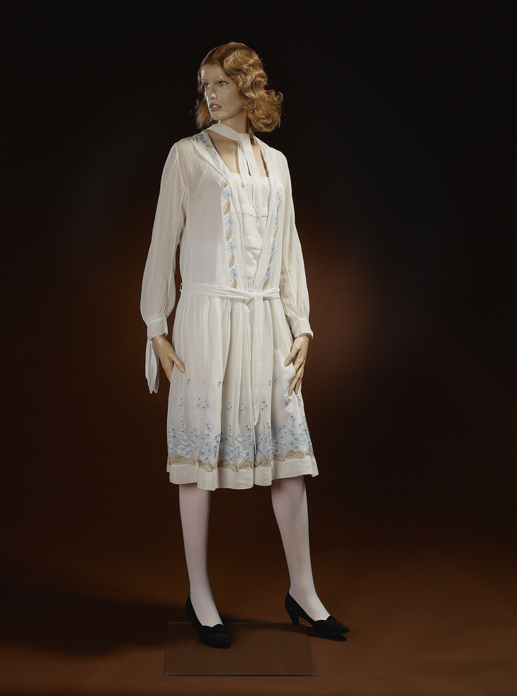 Witte zomerjapon van batist, gekleed model, met los ceintuurtje. Broderie in lichtblauw, bruin, lichtgroen en lichtbruin.- Trefwoorden