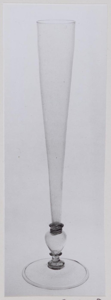 Helder kleurloos, grijs getint glas. Licht conische voet met omgeslagen rand. Basisschijf. Holle balusterstam met twee schijven. Hoge conische kelk.- Trefwoorden
