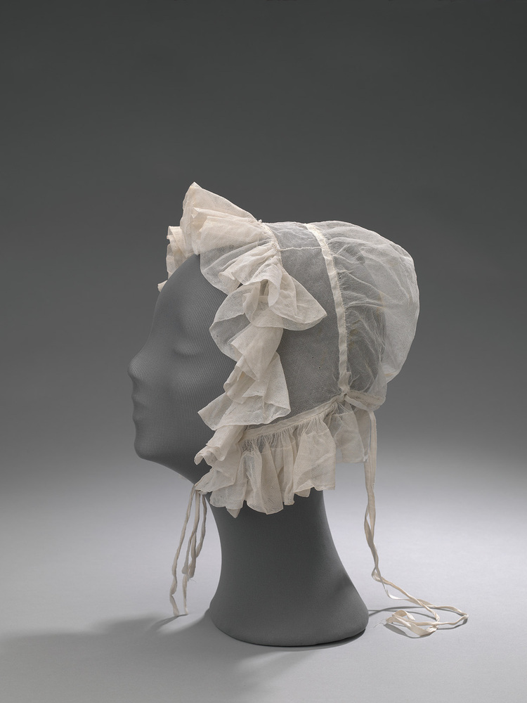 Cornetmuts van witte tule, twee paar banden om onder de kin te strikken. Met lange banden die om het hoofd werden vastgezet om de achterkant in te halen. Bijzondere muts.