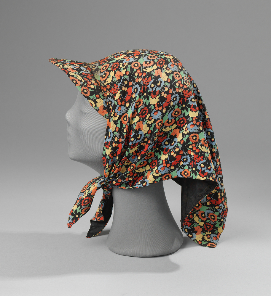 Hoofddoek met klep van kunstzijde (veelkleurig gebloemd) op zwart fond, gevoerd met zwarte zijde. Zwart elastiekje.- Trefwoorden