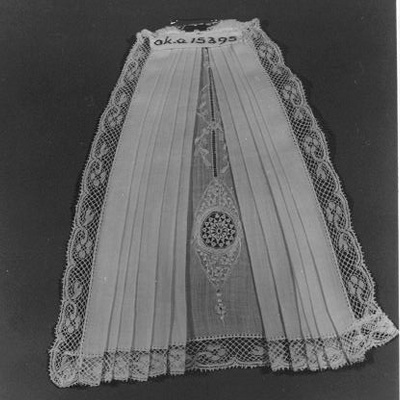 Witte jabot van geplisseerde katoen met in het midden machinaal geborduurde katoen, langs de randen machinale kant. Aan de achterzijde speciale jabotsepld, om de jabot op de japon te zetten.- Trefwoorden