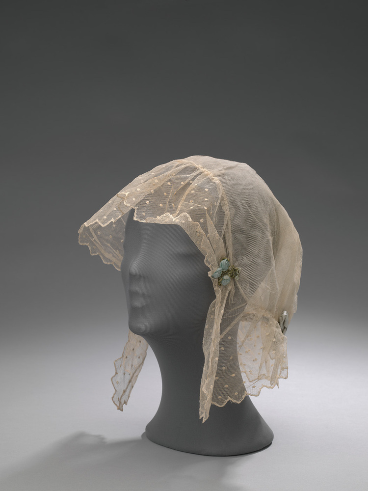 Witte muts van tule met machinale kant, blauwe zijden strik op de bol. Werd gedragen als ochtendmuts, in het boudoir. Werd in de jaren 1920-1930 boudoirmuts genoemd.- Trefwoorden