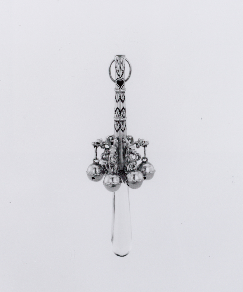 Rammelaar met zes bellen en een fluitje. Taps toelopende steel en pegelvormig uiteinde van geslepen bergkristal, tevens als handgreep dienend. Bovenzijde steel met fluitje met hartvormige opening en ring ter bevestiging aan thans niet meer aanwezige ketting. Onderzijde steel met zes armen in de vorm van wit geëmailleerde dierenkoppen met rode oogjes waaraan zes ronde bellen hangen. Langs mondstuk fluit en op steel gestileerde acanthusbladeren, geaccentueerd met zwart email.