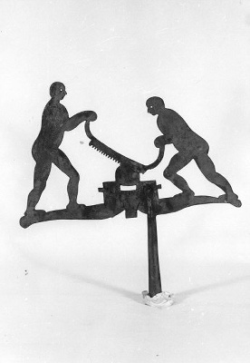 De beide mannen zijn met een uit verschillende zaagbladen samengestelde brede rasp, bezig een stuk brazielhout te 'raspen'. Het op deze manier verkregen zaagsel werd in de textielindustrie gebruikt voor het verven van stoffen. Op de gravure in Dapper, een gezicht in vogelvlucht op het Rasphuiscomplex, komen geen windwijzers voor. Op een dekselbokaal (KA 5460) met opschrift 't Welvaaren van de Tuchthuysmolen is de kort na 1787 herbouwde molen van het Rasphuis aan de Kostverlorenvaart bij de Overtoom afgebeeld. Het theekoepeltje naast de molen is voorzien van een windwijzer, sterk gelijkend op dit exemplaar.