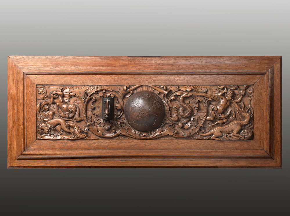 Afkomstig uit Koestraat 5, van 1681 tot 1712 woonhuis en werkplaats van Jan van der Heyden (1637-1712), schilder, graveur en uitvinder. Toont temidden van acanthusbladeren twee zinnebeeldige voorstellingen op de belangrijkste vindingen van Van der Heyden: de straatverlichting en de slangenbrandspuit. In het midden een wereldbol. Links de verdrijving van de krachten der duisternis door een nieuwe straatverlichting. De personificatie van de nacht, een gewapende dief en een vos met een prooi vluchten voor het licht van een in het deurstuk opgenomen lantaarnmodel van Van der Heyden. Rechts de brandbestrijding, gesymboliseerd door een slang en een putto - de laatste met fakkel en granaatappel - beiden waterspuwend een vuurhaard bestrijdend. Op de voorgrond een salamander. Het deurstuk vormde met de twee gevelversieringen in de vorm van vlammen, twee stoepleuningen in de gedaante van slangen en een tweetal verzen in de vestibule een opmerkelijke inconografisch programma. Wagenaar merkte in 1767 het gesneden reliëf boven de deur op. In 1864 maakte C.N. Looman een tekening van het pand Koestraat 5, waarop deurkalf en de slangenleuningen te zien zijn. Ook tekende hij het reliëf afzonderlijk.