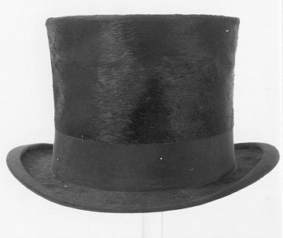 Zwarte hoge herenhoed, de bol en de rand van de hoed zijn langs de randen afgezet met ripslint. Aan de binnenzijde zitten twee stickers. Een grote witte sticker heeft het opschrift 53, op een kleine witte sticker is met de hand in rode inkt geschreven "aangeboden door T.H. van der Veen Tutein Noltheniusstraat 2 II Amsterdam". Met bijbehorende hoedendoos met roze binnenkant.