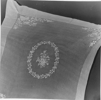 Wit batisten doopkleed, geborduurd au plumetis. Volgens mededeling van de heer Schulz werd het kleed gemaakt op het burgerweeshuis voor een van zijn grootouders, die zitting had in het bestuur van het weeshuis. De bijbehorende doopjurk bevindt zich bij familie van de heer Schulz in Australië.