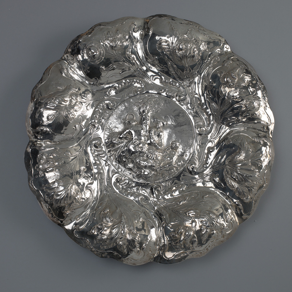 De schotel is een voorbeeld van de bloemstijl die in het derde kwart van de zeventiende eeuw in het Nederlandse zilver opkwam. De voorstelling op het middenveld van de schotel gaat terug op een gravure door Frederick Bloemaert (na 1610-na 1669), naar een tekening van zijn vader Abraham Bloemaert (1564-1651) (Rijksprentenkabinet, Amsterdam, inv.nr. RP-P-BI-1473) (afb. Xa) De prent behoort tot een reeks van vier genrescenes van figuren die luieren (een 'leisure-serie'). De voorstelling toont een jonge dief die een over haar mand in slaap gevallen vrouw van haar geld berooft (Roethlisberger 19xx, p. 243-244 nr. 367). De in het zilver gedreven compositie verschilt van het gedrukte voorbeeld. Zo lijken de figuren - die hier in een landschap zijn gesitueerd - vreedzaam bezig met het binden van koren. Van een beroving is geen sprake.