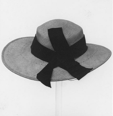 Strohoed met zwart lint en strik met vouwen op achterzijde. Langs de buitenrand een donkere rand. Elastiek langs binnenzijde bol om langs de achterzijde van het hoofd de hoed vast te zetten.- Trefwoorden