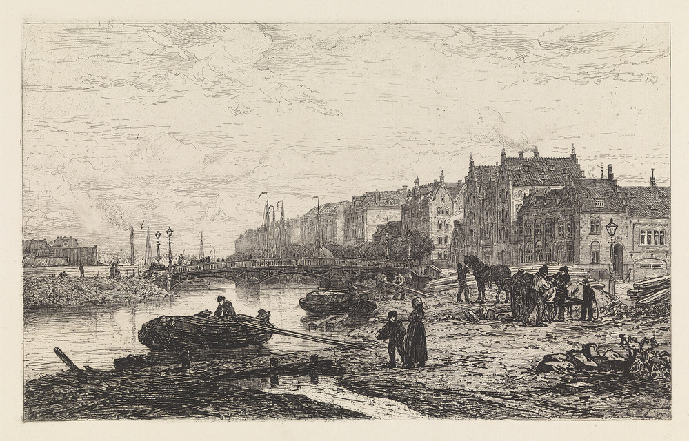 - Singelgracht in oostelijke richting met brug naar de Ferdinand Bolstraat, rechts het hoekhuis "De hooiberg" van de Heineken brouwerij, 1876