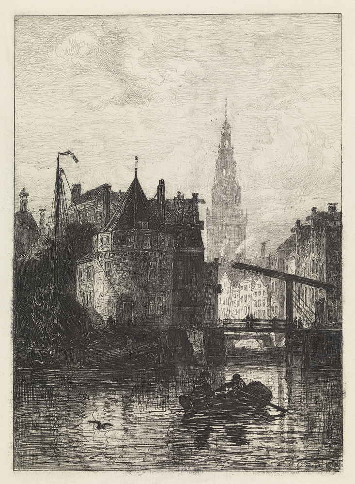 - De Schreierstoren, op de achtergrond de toren van de Oude Kerk, 1857 - 1891