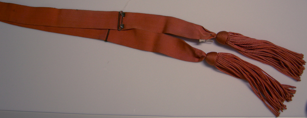 Oranje zijde, aan de uiteinden een kwast. Op 26 cm. vanaf de onderkant aan weerzijden metalen sjerphaken.- HerkomstGedragen door de grootvader van de schenkster, Pieter de Clerq, geboren te Amsterdam 21 januari 1849, overleden te Zeist, 9 mei 1934 (schr. Mevr. Dudok van Heel, dd. 27.7.1973)