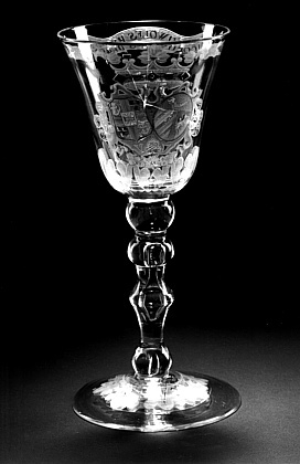 Helder kleurloos glas. Conische voet. Basisknoop met langgerekte luchtbel. Dubbele balusterstam met twee knopen en langgerekte luchtbel. Conische, licht uitbuigende kelk met afgeronde basis. Op kelk in radgravure het alliantiewapen Alewijn-Van Hoorn in een cartouche-omlijsting, waarboven een gravenkroon. Op andere zijde een tekstlint met het opschrift: NOORD WOLFS BERGEN/. Rondom basis kelk en voet gestileerde bladeren. Gepolijste details.