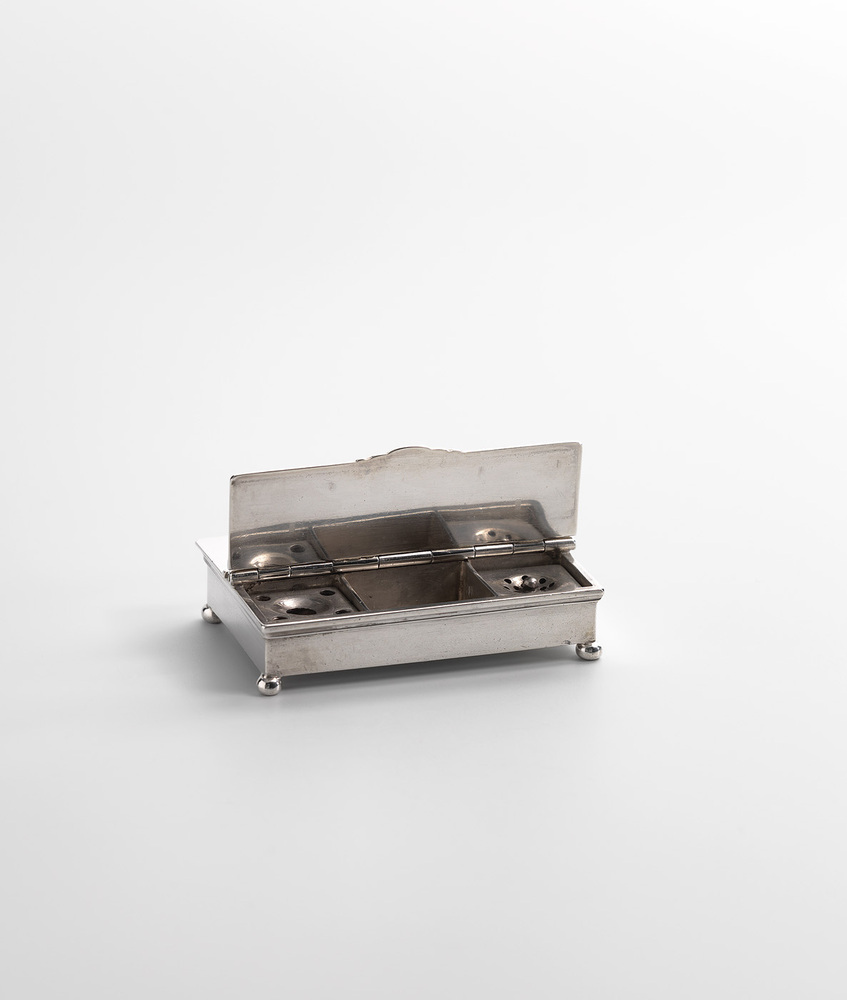 Doos met inktstel, 1649 - 1689 Amsterdam zilver hoogte: 1.66 cm; breedte: 6.3 cm; gewicht: 76.19 gram; meesterteken onderzijde doos: lelie: Lelie/ fleur de lis