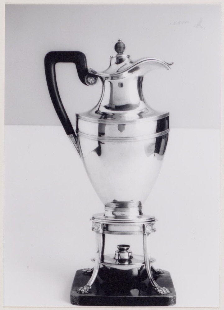 Ovale koffiekan met scharnierend deksel op ovaal komfoor met brander op voetstuk van zwart gekleurd vruchtenhout. Komfoor met gladde ring tussen filetranden en vier gebogen poten, de onderzijde uitlopend in leeuwenklauwen, de bovenzijde met vierkante velden waarin rozetten. Tussen poten een ovale brander steunend op ring. Koffiekan met platte voet op rechtwandige basis, in ring van komfoor passend. Lichaam met hoger oplopende korte zijden en overgaand in zich verjongende hals. Hals aan een zijde overgaand in schenktuit. Hoekig gebogen oor van ebbenhout in zilveren vattingen, de bovenste opgelegd met rozetten. Gewelfd, zich verjongend deksel met geribde bolvormige knop van ebbenhout. Filetranden langs onderzijde voet, bovenzijde lichaam en rand deksel.