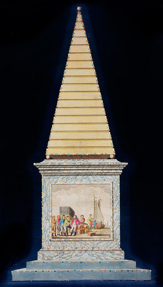Stadhouder Willem Vvluchtte in 1795 met zijn familie naar Engeland, vanaf het strand bij Scheveningen. De tekst luidt: ‘Daar vlugt de dwingeland uit Neerlands vrije Staaten;/ Daar vlugt zijn snoode vrouw, die, door haar trotsch verblind,/ Geen wellust, dan alleen in ‘t onderdrukken vindt;/Ook vluchten beider zoons, die deugd en vrijheid haaten:,/ Als zo veel wanbedrijfs, ‘t wanhopig hart beknelt,/ Wat wonder dat men dan de wraak des volks ontsnelt!’. ( Lodewijk Wagenaar)