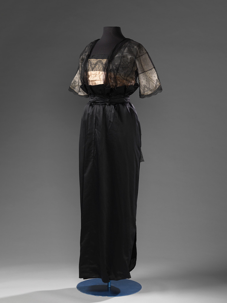 Zwarte zijden satijn japon met verhoogde taille, korte mouwen en nauwe, rechte rok. Lijfje met kant waaronder cremekleurige voile.