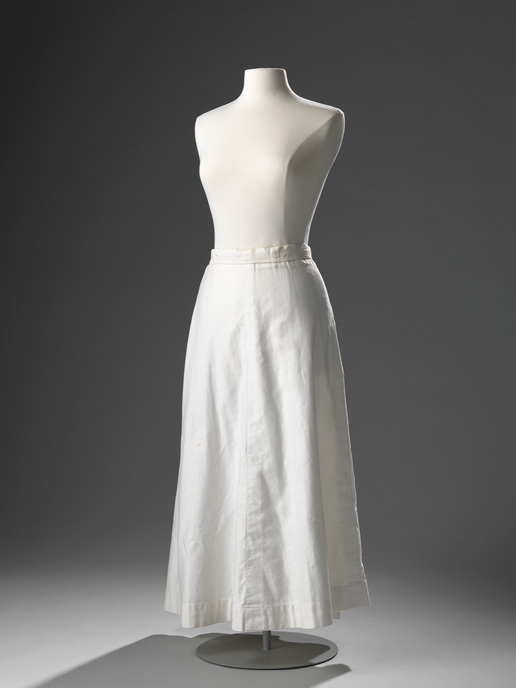 Tennisrok van wit katoen, de tailleband is naar binnen geslagen.