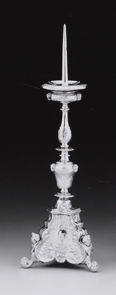 Driezijdige kandelaar met hoge voet, dubbele balusterstam en schijfvormige kaarsenhouder. Afgeschuinde hoeken voet met vrijstaande cherubijnenkopjes, de vleugels doorlopend op zijden voet. De onderzijden uitlopend in drie poten in de vorm van omkrullende bladvoluten. Zijden voet met ovale medaillons met cartouchevormige omlijstingen in kwabstijl, waaronder schelpmotieven. Medaillons met drie gedreven voorstellingen van heiligen en hun attributen, te weten: St. Anna te Drieën, Elisabeth van Thüringen met drie kronen en een bedelaar, en Maria Magdalena. Voet met zich verjongend middendeel met afhangende acanthusbladeren. Op onderzijde voet is gegraveerd: 1638/. Stam met afgeplatte knopen en geschulpte kragen, waartussen nodus en baluster. De nodus vaasvormig, versierd met acanthusbladeren, palmetten en cherubijnenkopjes; de baluster versierd met acanthusbladeren en palmetten. Kaarsenhouder met cherubijnenkopjes, alternerend met vruchtentrossen. Vetvanger met afhangende rand van godrons. Kaarsenpin.