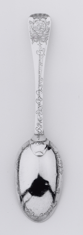 Lepel met ovale bak, steel met ribbe en afgeronde kop, dubbel Amsterdams lof. Op onderzijde steel en langs rand onderzijde bak is gegraveerd: Ter gedachtenisse van den Hoog Ed: Geb: Heer W:L: Grave/ van Nassau Vrijheer van Bergen Hr: van de mijll in Cortgeene en in middelharnas Obiit den 17 Junij 1792/. Op onderzijde steel is het gekroonde wapen van graaf Willem Lodewijk, Vrijheer van Bergen en Middelharnis gegraveerd, gehouden door een leeuw en een griffioen, staand op een plint met bloemenguirlande en culot.