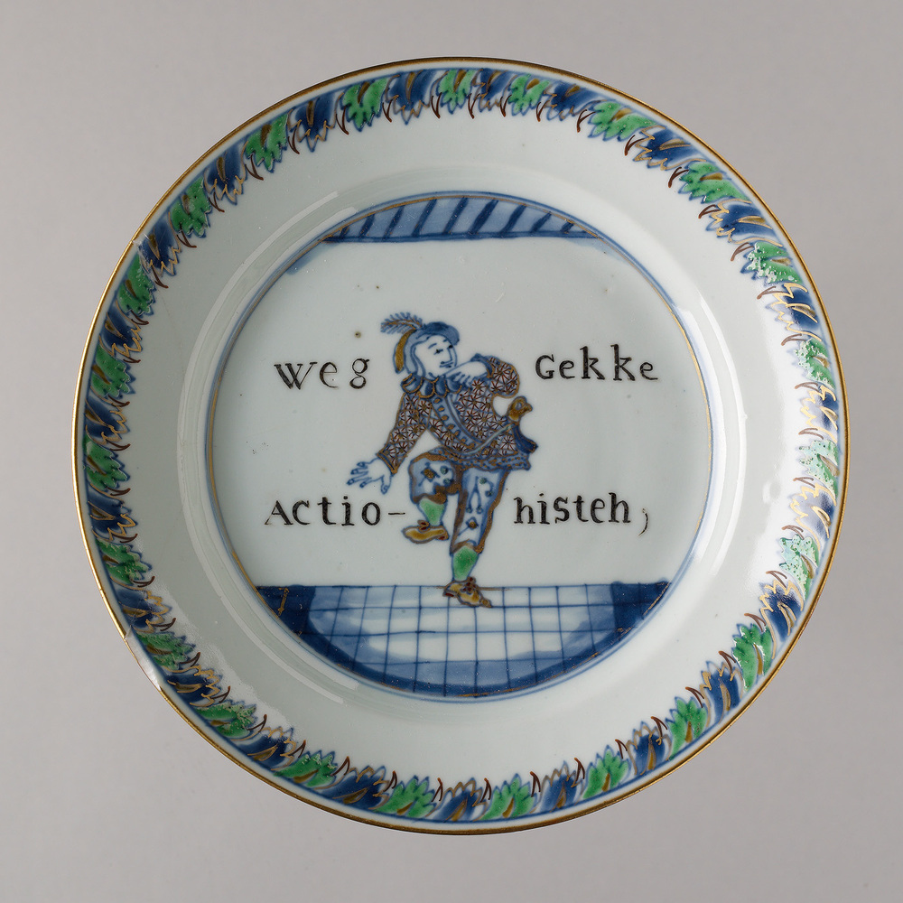 opschrift op het plat: WEG/ACTIO, GEKKE/NISTEN: links van figuurtje onder elkaar: WEG ACTIO en rechts onder elkaar: GEKKE NISTEN