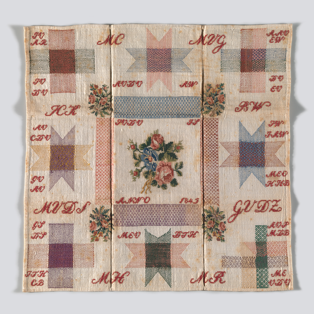 opschrift in de hoeken, binnenzijde middenkader, kloksgewijs: JVDV / JS / 1845 / ANNO: JVDV: Johannes van der Vegt, vader van borduurster