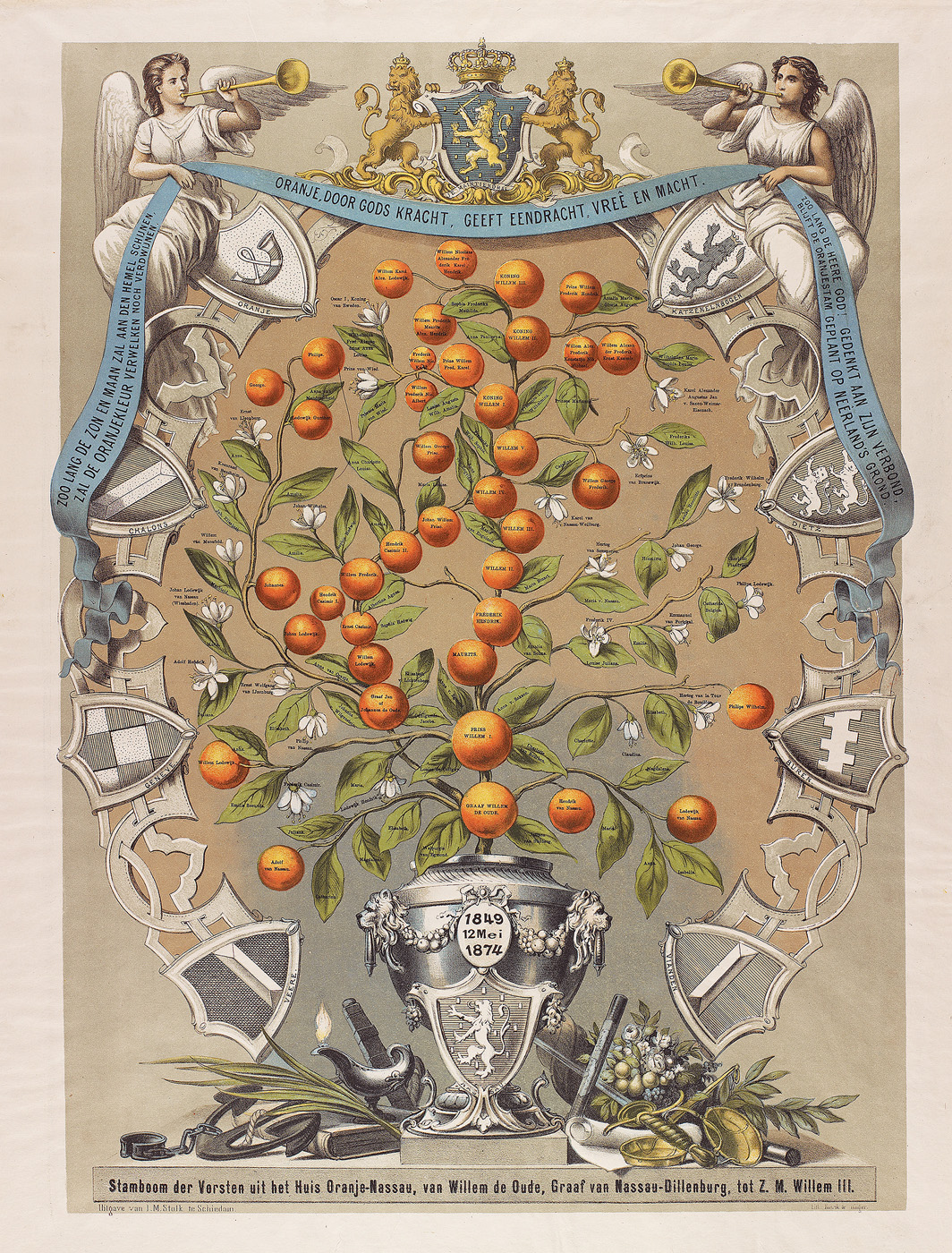 opschrift mid o. in de steen: stamboom der vorsten uit het huis oranje-nassau, van willem de oude, graaf van nassau-dillenburg, tot z.m. willem III