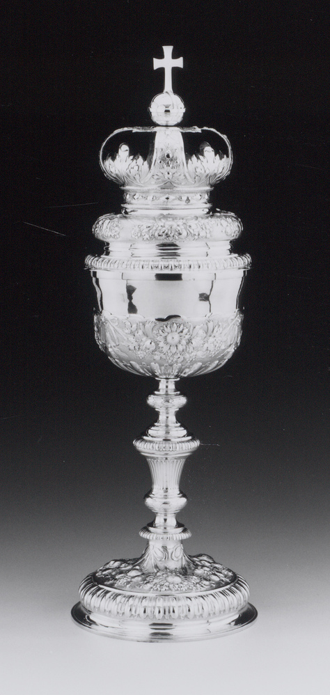 Een ciborie is een met een deksel afgesloten kelk waarin de geconsecreerde hosties worden bewaard. Dit exemplaar - waarvan niet bekend is voor welke kerk hij is vervaardigd - behoort tot het gangbare type, dat nog aansluit bij zeventiende-eeuwse vormtradities. Kenmerkend is de grote opengewerkte kroon bovenop het deksel, die in de loop van de achttiende eeuw minder veelvuldig werd toegepast. Zo ontbreekt dit in het oog springende sierende element bij een door Willem Gerhard Sipke vervaardigde ciborie uit 1794 (cat.nr. KA 14670). ( Bert Vreeken)