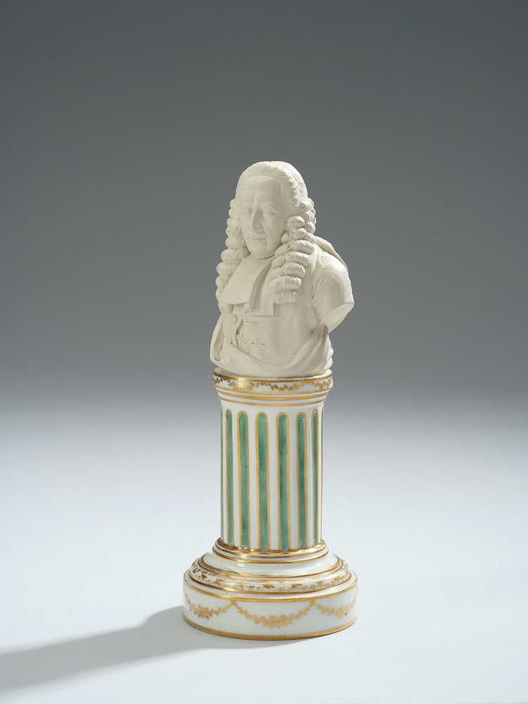 Buste van Hendrik Danielsz Hooft (1716-1794) op geglazuurde zuil met cannelures in groen en goud, staande op ronde geprofileerde plint, versierd met gouden biezen. De buste is vervaardigd naar een prent van R. Vinkeles en C. Bogerts, naar H. Pothoven