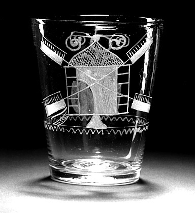 Helder kleurloos glas. Vlakke bodem. Conisch lichaam. Rondom lichaam een molen en een gestileerde plant op een grondje.- Trefwoorden