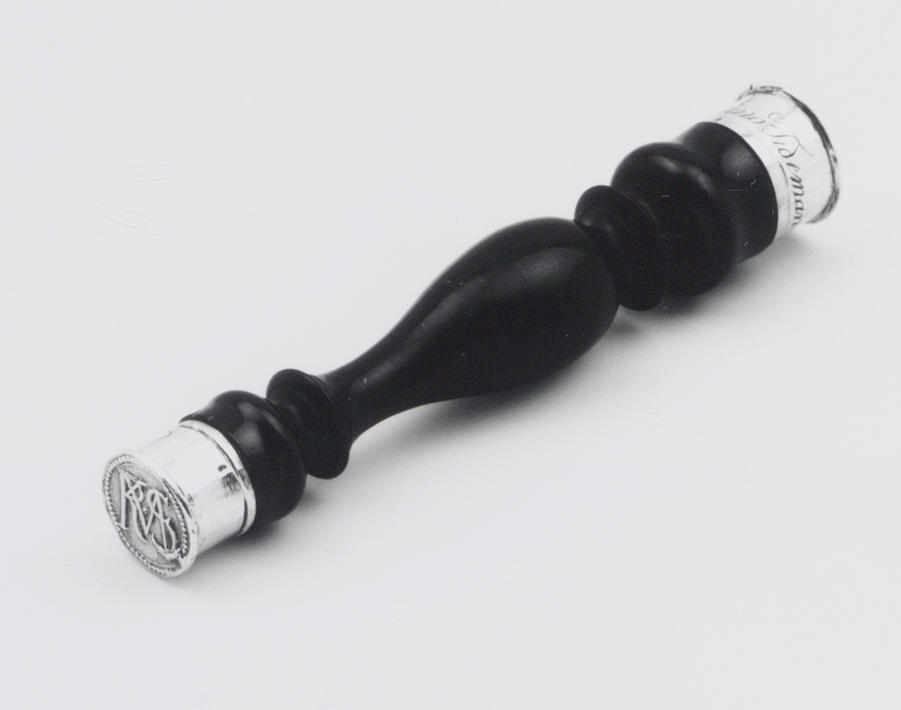 Balustervormig, geprofileerd ebbenhouten stokje met breed en smal uiteinde, elk gevat in een gegoten cilindervormige dop van zilver. Beide doppen met een vlakke, uitstekende bovenrand en gegroefde rand langs onderzijde. Bovenzijde grote dop met in reliëf op een geruwde ondergrond het gekroonde wapen van Amsterdam, gehouden door twee leeuwen. Op wand is gegraveerd: Bruno Tideman Joannesz/. Bovenzijde kleine dop met in reliëf op een geruwde ondergrond de letters: MKLRS/ in monogram (de medeklinkers in het woord makelaars) binnen parelrand. Op wand is gegraveerd: Ao 1766/.