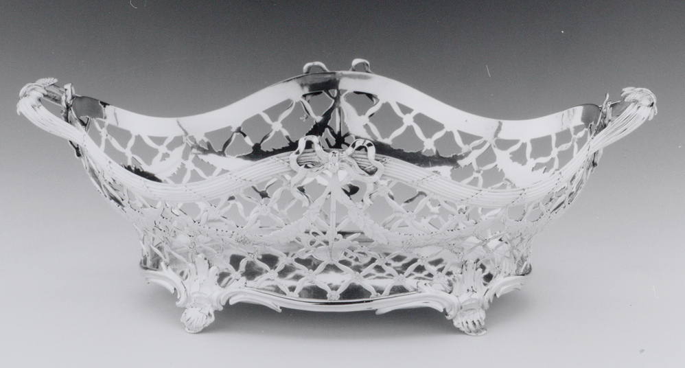 Ovale mand met vlakke bodem, gevat in onderrand, opgebouwd uit C-voluten. Rand onderbroken door vier dubbele rocaillemotieven, tevens fungerend als pootjes. Gewelfde wand, ajourgezaagd met vlechtwerk van linten met rozetjes op de kruispunten, alsmede acht bloem- en bladguirlandes, de buitenzijde gegraveerd, de binnenzijde glad. Golvende bovenrand met opgelegde fascesrand. Korte zijden uitlopend in twee gebogen oren, elk samengesteld uit korenaren. Op midden der zijden vier gestrikte linten, de lange zijden met afhangende trofeeën van muziekinstrumenten, de korte zijden met lege medaillons.