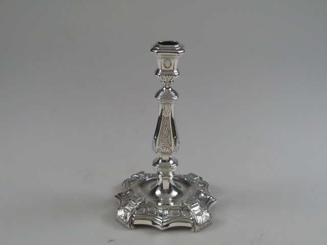 Kandelaar met vierkante, geprofileerde voet met ingezwenkte zijden en afgeschuinde hoeken, de bovenzijde concaaf. Op voet gestileerde lambrequins, de hoeken met omkrullende schelpen, palmet- en acanthusbladeren op een geponste ondergrond. Balustervormige stam met vierkante nodus, de zijden met rozetten op geponste ondergrond en afgeschuinde hoeken. Zijden baluster met lambrequins, schelpen, acanthusbladeren op een deels geponste ondergrond, de hoeken met palmetten. Vaasvormige kaarsenhouder met afgeplatte hoeken en geprofileerde randen. Op lichaam kaarsenhouder afhangende palmetten en geponste ovale medaillons. Op voet is later het helmteken van de graven van Listowel (Ierland) gegraveerd. Sporen van vergulding. Onder voet is later gegrift: No 954 2/OZ 68-2, £ ea=ww=x, de prijs in geheimschrift.