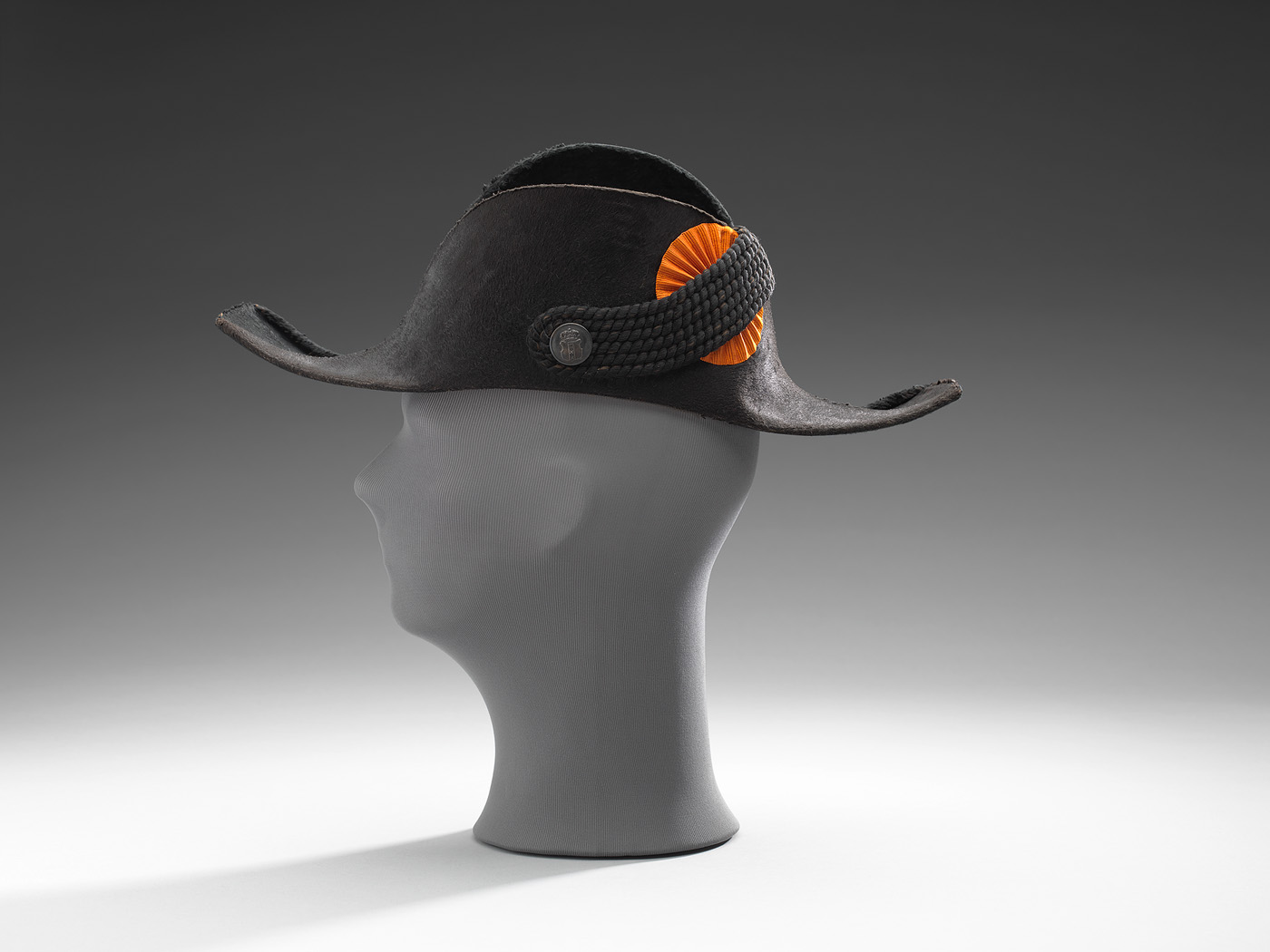 zwart met oranje cocarde, zwart galon en zilveren knoop met het Amsterdamse wapen. In de doos goudkleurig fluwelen 'opdof-kussentje' (16 x 10) met zilver: