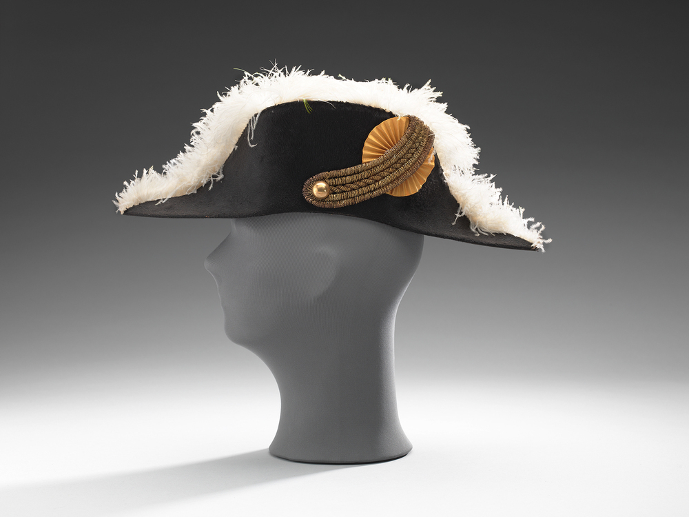 zwarte steek, goudgele cocarde, goudgalon, goudkleurige knoop en witte stuisveren.