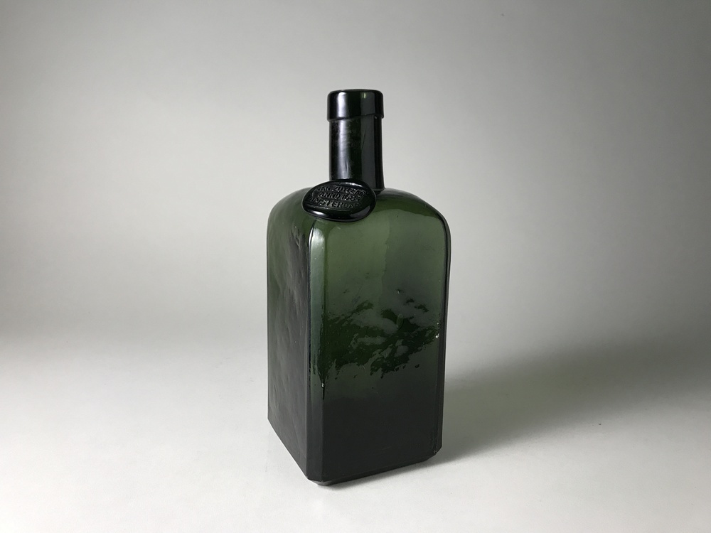 Donkergroen glas. Vlakke vierkante bodem. Rechthoekig lichaam met afgeschuinde hoeken, afgeronde schouder en hals met lip. Op schouder een glaszegel met het opschrift: VAN ZUYLEKOM/ ANNO 1684/ AMSTERDAM/. Op voorzijde lichaam een etiket met rode en zwarte opdruk van een dominosteen en het opschrift: OUDE/ GENEVER/ 1 OM 5/ VAN ZUYLEKOM ANNO 1684/ AMSTERDAM/. Gemerkt met ster op onderzijde bodem.